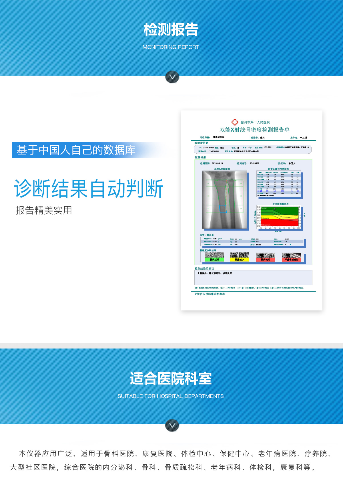 產(chǎn)品用途:本儀器應(yīng)用廣泛,適用于骨科醫(yī)院、康復(fù)醫(yī)院、體檢中心、保健中心、老年病醫(yī)院、療養(yǎng)院、大型社區(qū)醫(yī)院,綜合醫(yī)院的內(nèi)分泌科、骨科、骨質(zhì)疏松科、老年病科、體檢科,康復(fù)科等。